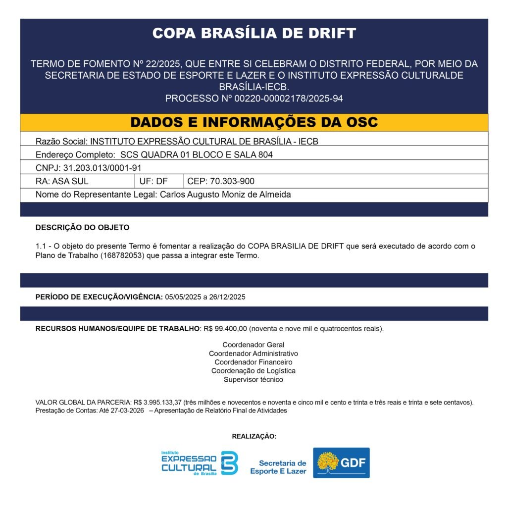 - Organizar e executar 4 etapas competitivas da Copa Brasília de Drift 2025, uma em cada Região Administrativa (RA), garantindo estrutura técnica e de segurança adequadas para atletas e público.